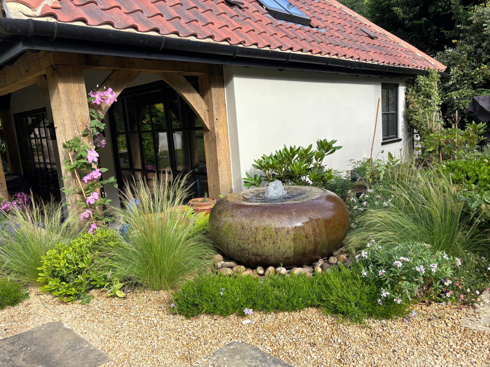 Our experience with koi ponds has required detailed planning and technical expertise, particularly when integrating large filtration systems discreetly within the garden design. Equally rewarding are our fountain installations, which are often used to soften surrounding noise — including nearby roads — through the calming sound of moving water. Beyond aesthetics, water features are a genuine passion of ours, creating new habitats that encourage biodiversity and support insects and amphibians.